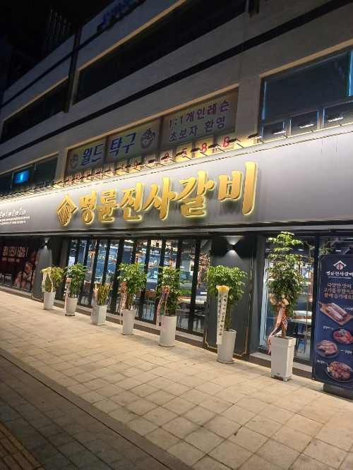 대로변에 크게 명륜진사 갈비 점이 들어왔길래 넘 반가왔어요. 예전에 양념 돼지 갈비를 저렴한 가격으로 괜찮게 먹은 추억이 있어서 늦게 학원 다녀온 딸아이 데리고 남편이랑 셋이서 손 잡구 갔어여. ㅎ ㅎ