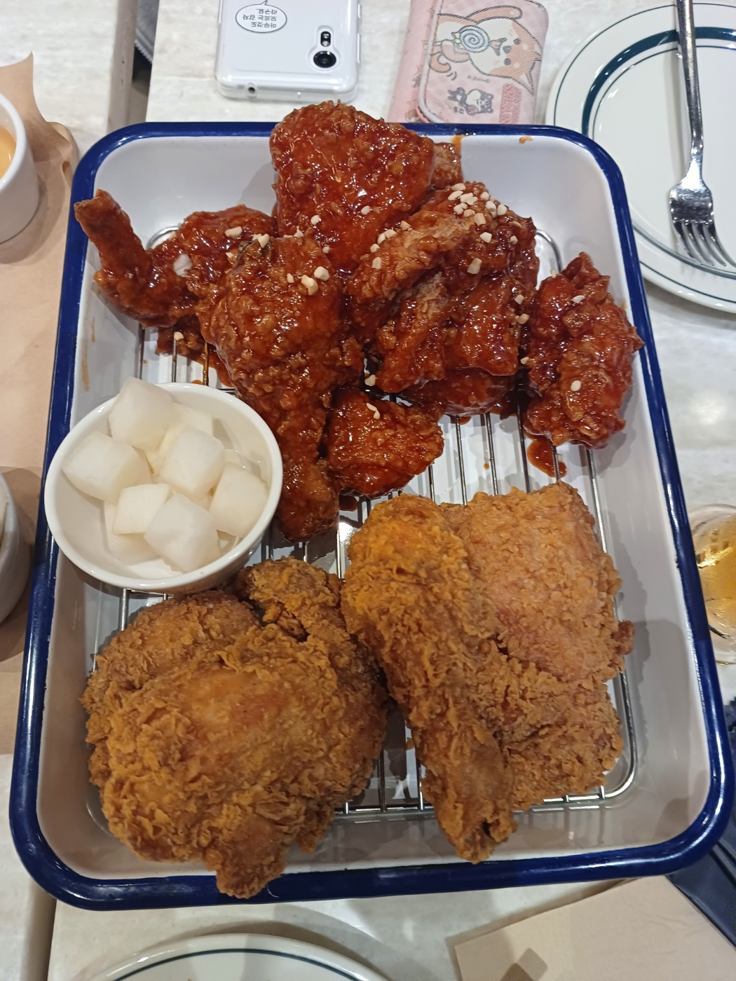 우리는 황금올리브 치킨 후라이드랑 양념 반반 주문했습니다. 맛은 바로 튀겨져서 나와서